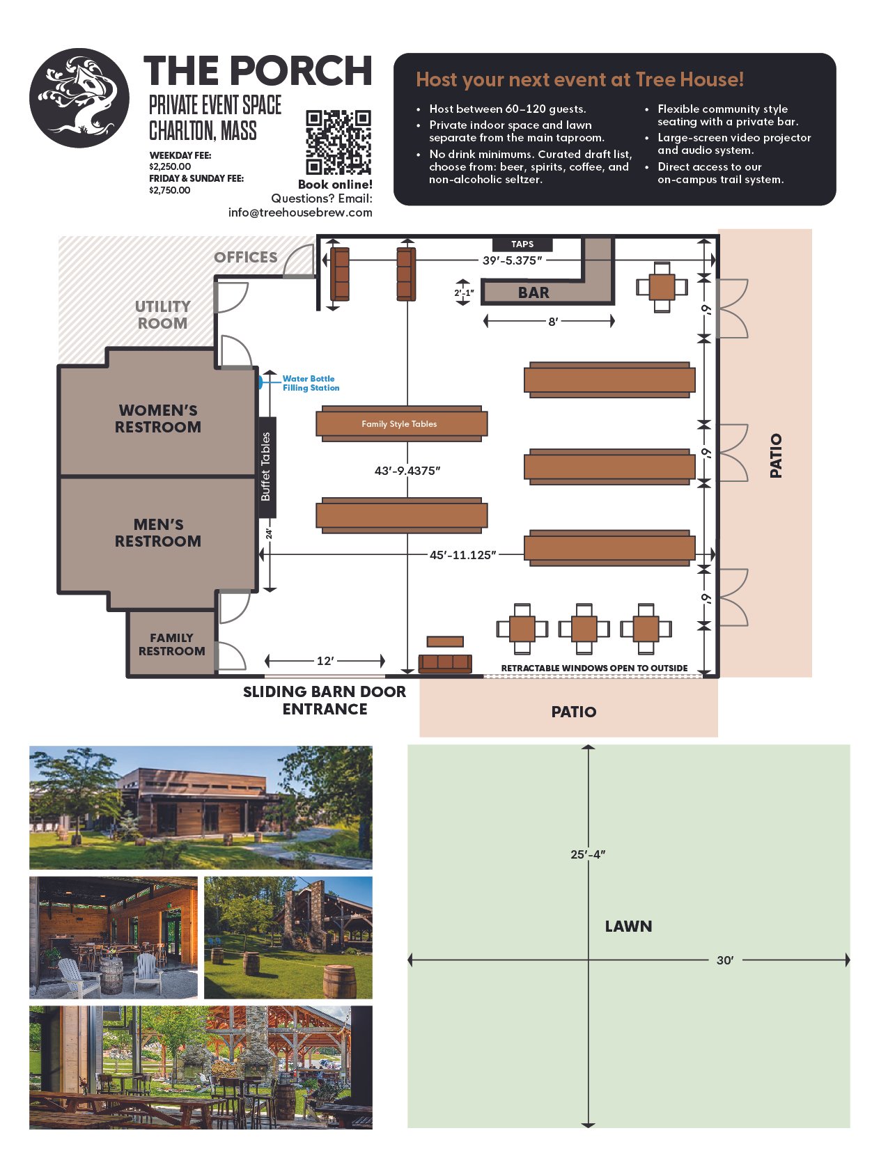 This space is available for you to enjoy when we are open to the public, so your group has the option to mingle into our regular public space as much as possible, or to remain as private as you’d like. You can also have a direct lane into our on-Campus trail system!